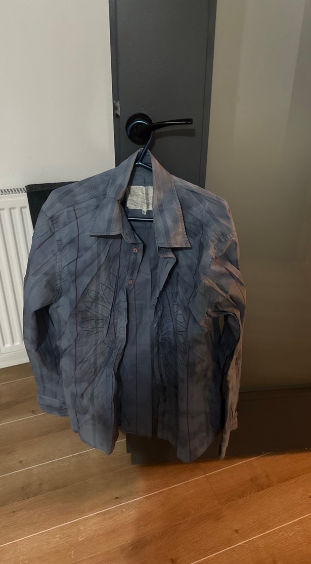 Gri keten erkek gömlek, çıtçıtlı ve kesik yakalıdır. Uzun kollu, normal boyda ve regular fit kesimdir, günlük sokak stili için uygundur. Göğüs 51 cm boy 75 cm