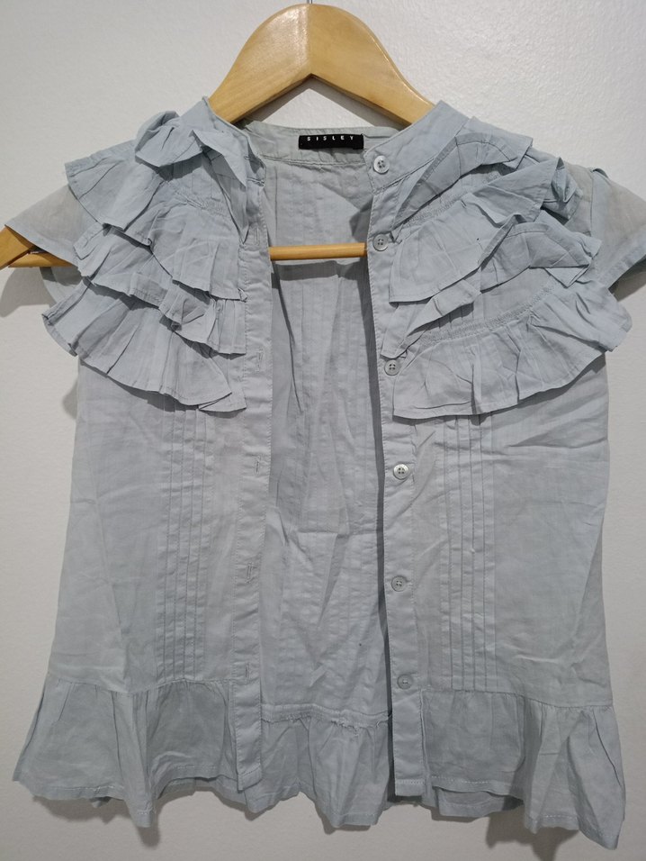 Keten kumaştan, kolsuz, yakalı ve omuz ile etek kısmında fırfır detaylı gri renkli bol kesim bluz. Günlük rahat sokak stili için uygundur.