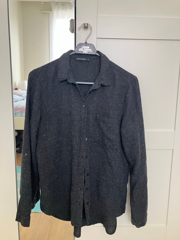 Gri düğmeli ve normal midi boyda, notched lapel yakalı bol kesim gömlek. Günlük kullanıma uygundur. Popoyu kapatıyor
