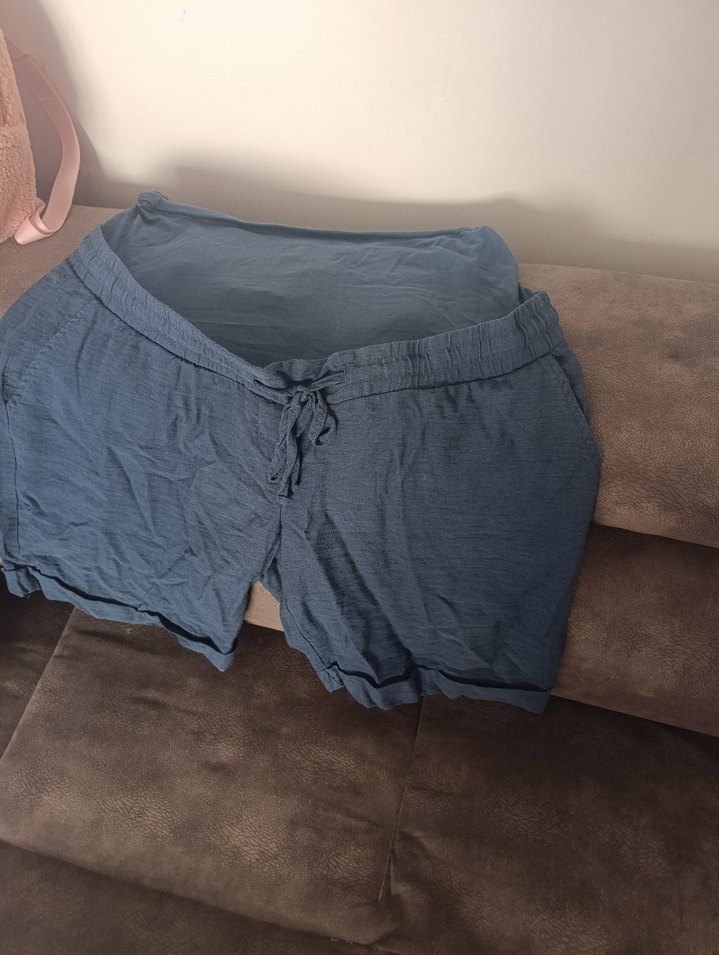Gri keten kumaştan, bol kesim mini hamile şortu, rahat ve şık bir görünüm sağlar.