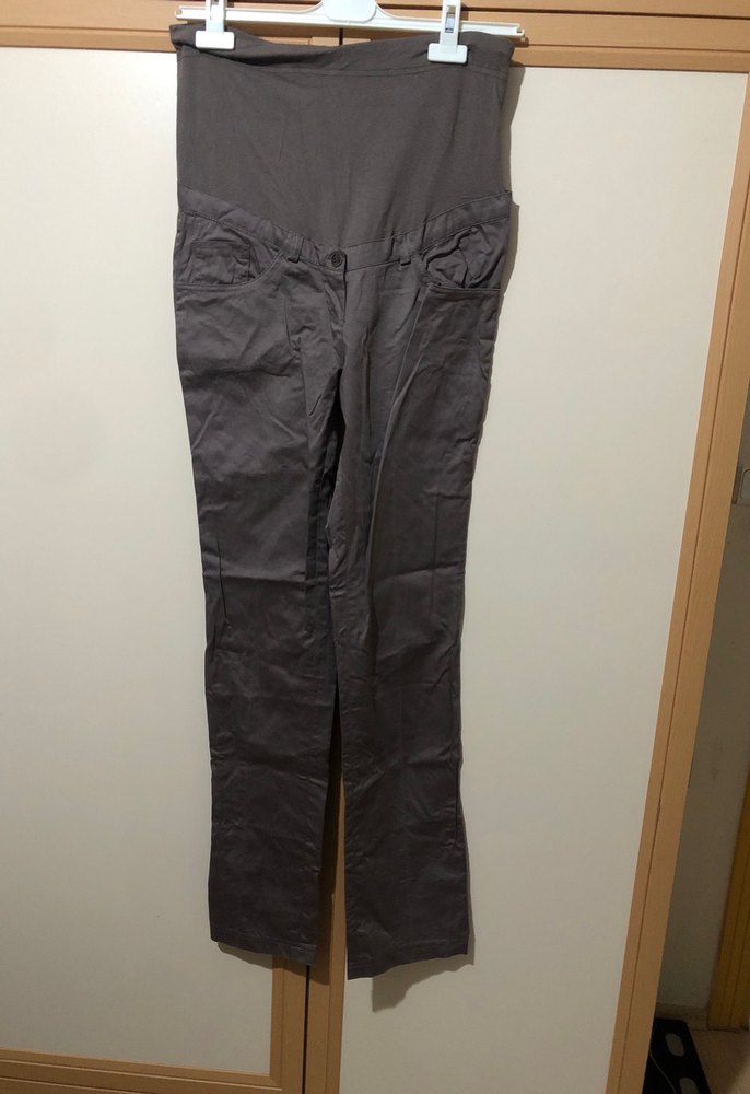 Gri keten kumaştan, kemerli ve normal boyda, rahat kesim hamile pantolonu. Günlük kullanıma uygundur.