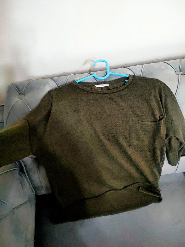 Keten kumaştan yapılmış, salaş kesimli gri hamile tişörtü. Uzun kollu ve yuvarlak yakalı, günlük rahat sokak stiline uygun. Rahat ve şık.