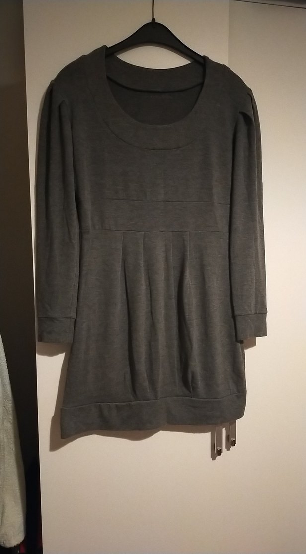 Gri keten hamile tunik, yuvarlak yaka ve uzun kolludur. Salaş kesimi ve midi boyu ile rahat günlük kullanım sağlar.