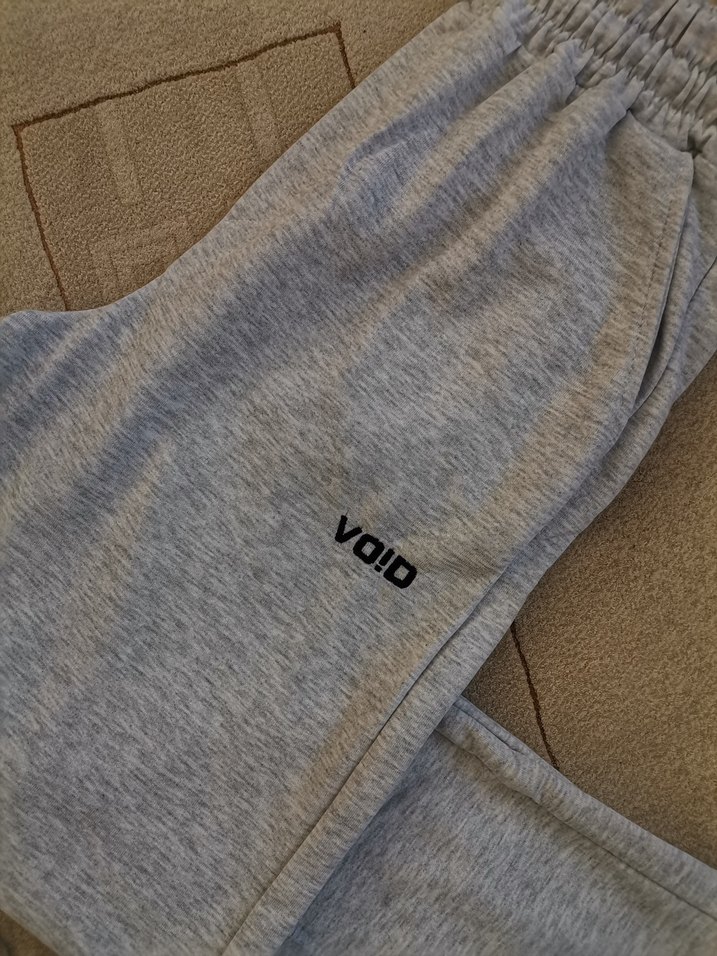 Gri keten kumaştan, Velcro detaylı, VO!D yazılı, bol kesim midi uzunlukta jogger pantolon. Günlük ve sokak stiline uygun.