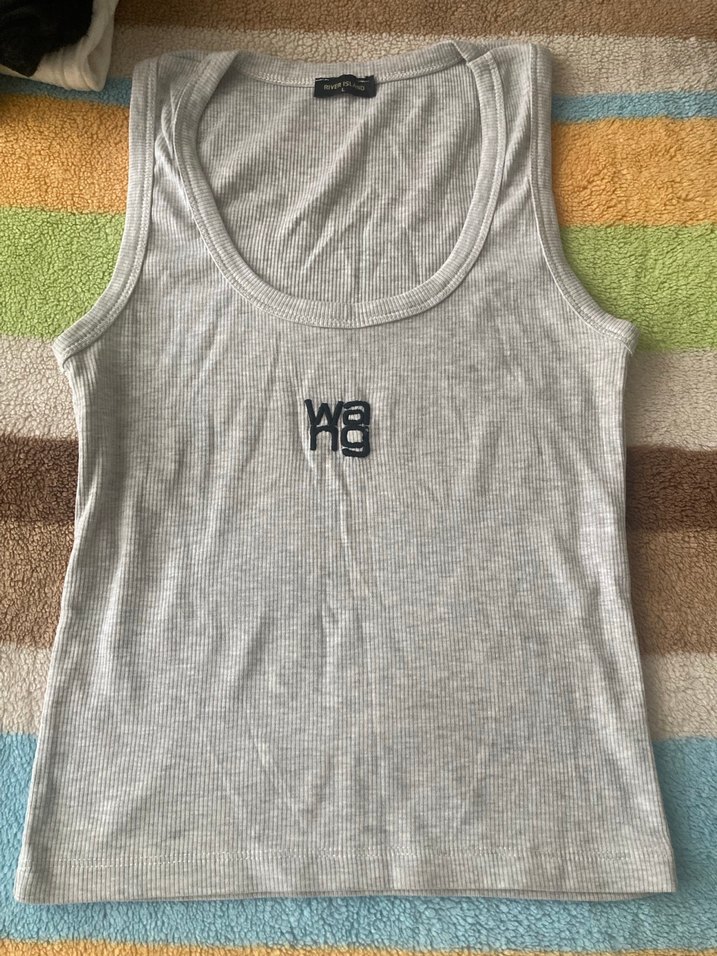 Salaş kesim, bisiklet yaka, gri keten kadın atlet. Minimal desen ve logo detaylı, günlük rahat kullanıma uygun.