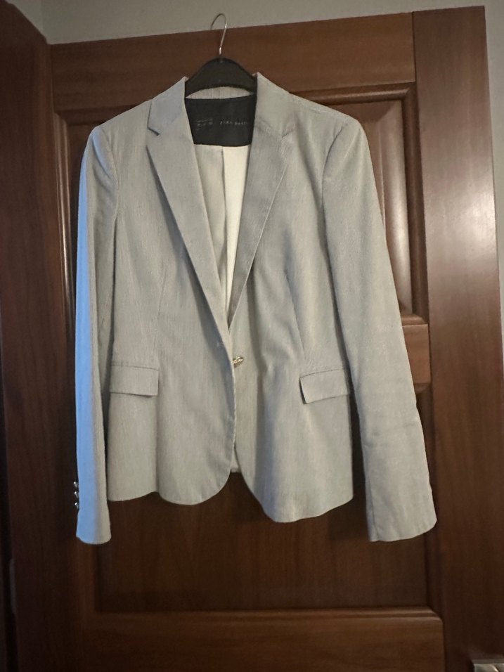 Gri keten kumaştan yapılmış, düğmeli, klasik yakalı kadın blazer ceketi. Normal kesim, uzun kollu ve midi boyda, ofis kullanımı için uygundur.