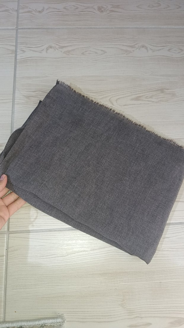 Gri keten kumaştan, bohem tarzda, rahat ve dökümlü kadın şalı.