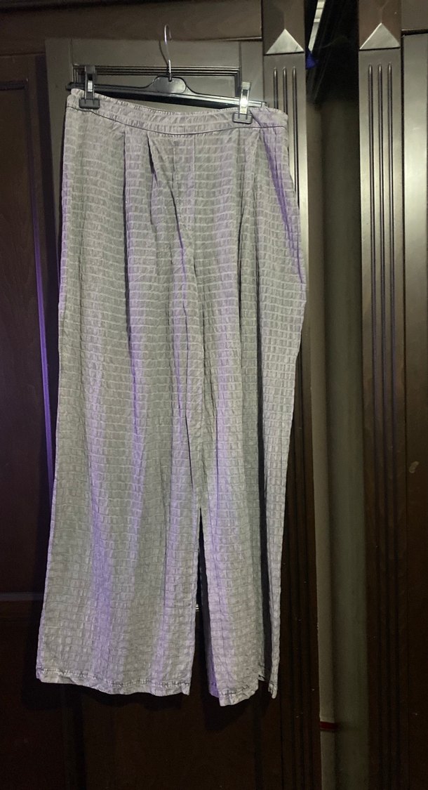Gri keten kumaştan, bol kesim ve pileli tasarıma sahip uzun pantolon, minimalist ve şık bir görünüm sunar.