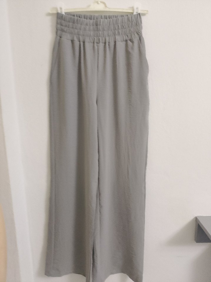Uzun paçalı, bol kesim gri keten pantolon, lastikli beliyle rahat ve şık. Minimalist, desensiz tasarımı günlük kullanıma uygun.