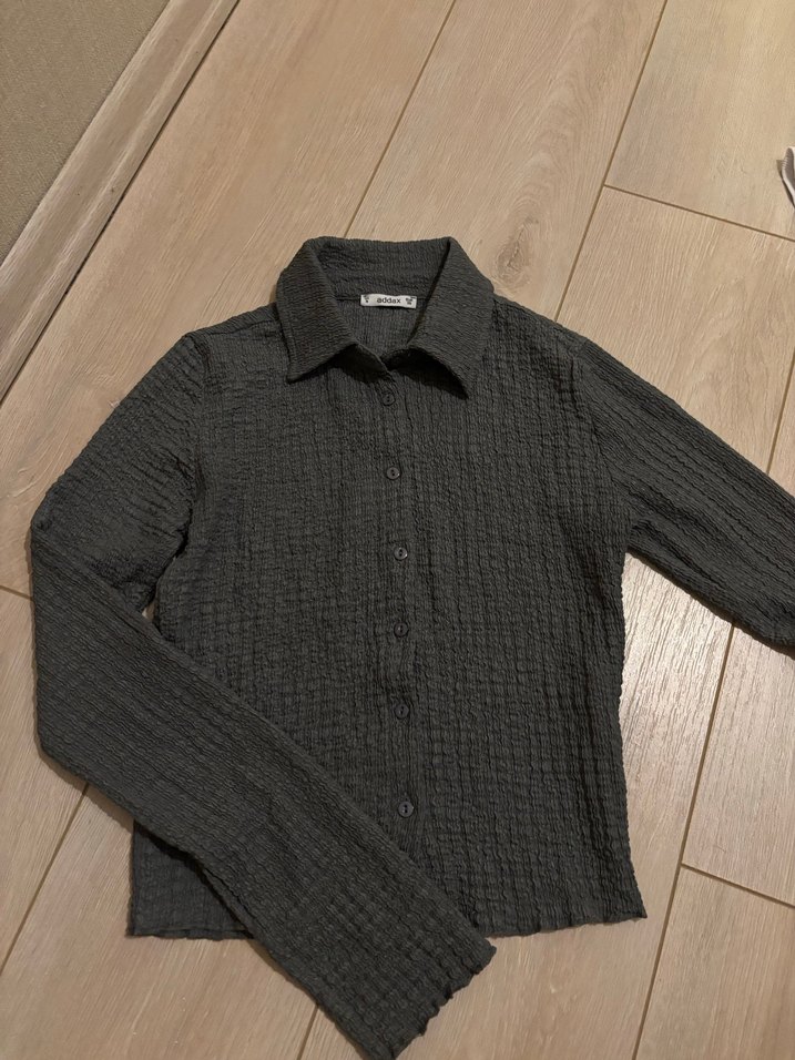 Gri keten kumaştan, uzun kollu, düğmeli ve yakalı, normal kesim kadın gömlek. Günlük kullanıma uygun rahat stil.