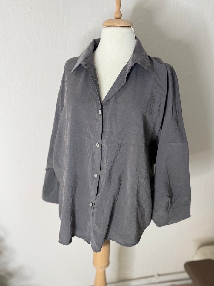 Gri keten kumaştan, düğmeli ve yakalı, bol kesim uzun kollu kadın gömlek. Günlük kullanım için uygun, midi boyda rahat bir model.