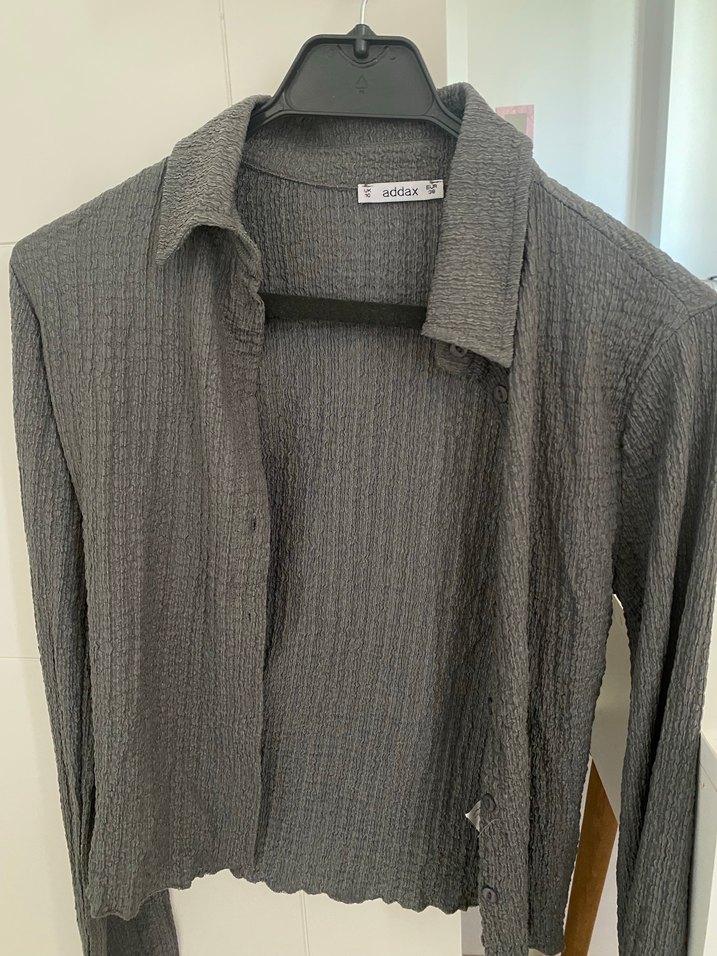 Gri keten kumaştan, düğmeli ve uzun kollu kadın gömleği. Notlu yaka ve bol kesim özelliğiyle gündelik kullanıma uygundur.