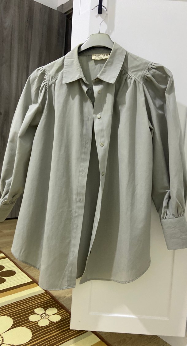 Gri keten kumaştan, düğmeli ve uzun kollu, bol kesim kadın gömlek. Midi boyda, yakalı ve ofis için uygun, sade normcore tarzda. Fotoğrafta gösterdiğim gibi terden kaynaklı gömleğin üst kısmında sararma olmuş o yüzden uyguna veriyorum. Hoops markadır