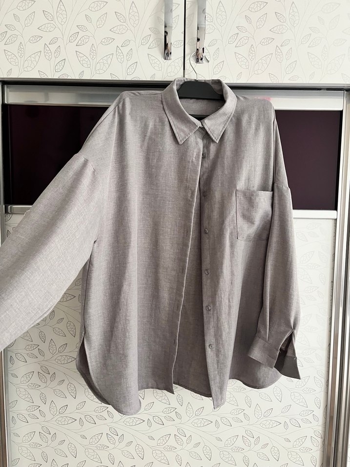 Gri keten kumaştan, rahat kesim ve uzun kollu kadın gömleği. Düğmeli ön ve göğüs cebine sahip, günlük kullanım için uygun sade bir tasarım.