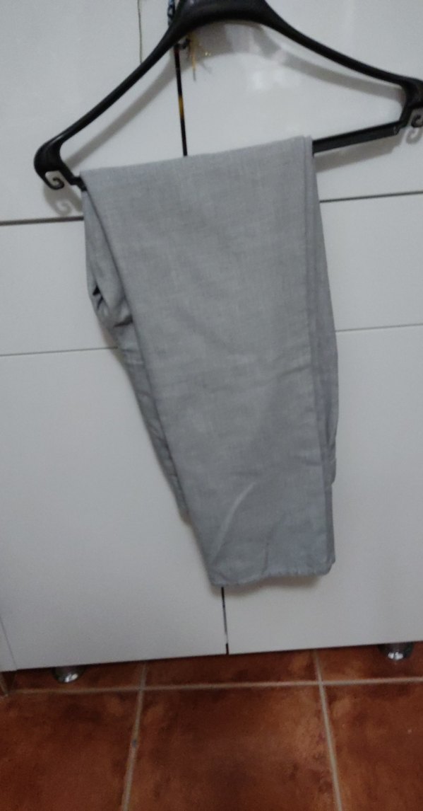 Gri keten kumaştan, normal boy midi uzunluğunda, rahat kesimli kadın pantolon. Minimalist ve sade tarz için uygundur.
