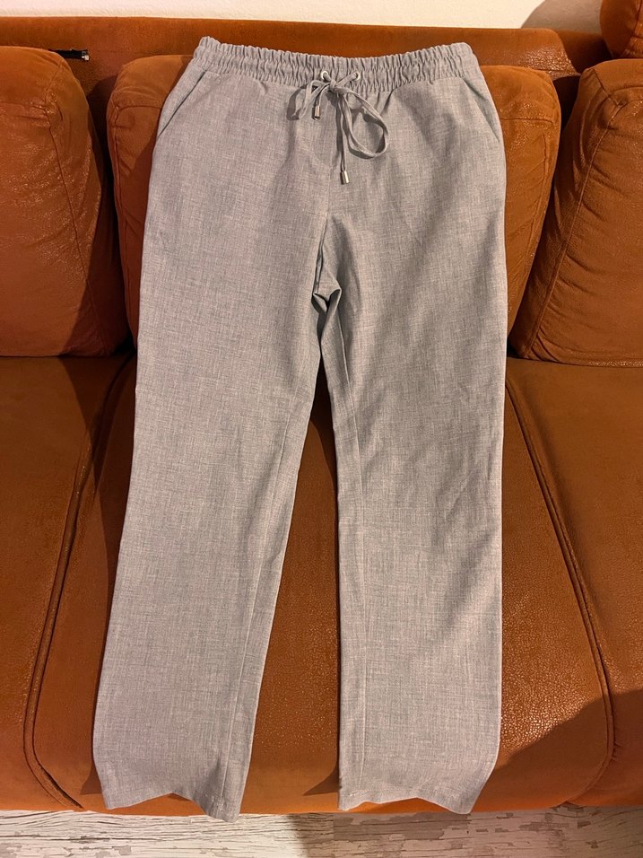 Gri kumaştan, rahat kesim ve normal boyda kadın pantolon. Elastik bel ve bağcık detayıyla günlük kullanıma uygun, sade ve şık bir tasarım.36-38 bedene uygun