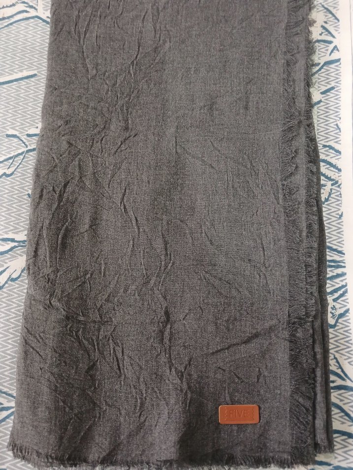 Gri keten kumaştan, salaş drapeli, rahat bohem tarzda sade ve temel kadın şalı.