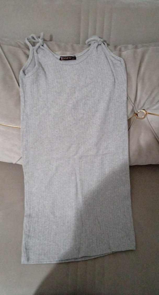 Keten kumaştan, kolu olmayan gri elbise, tekne yaka ve vücuda oturan kesimle rahat ve şık bir görünüm sunar.