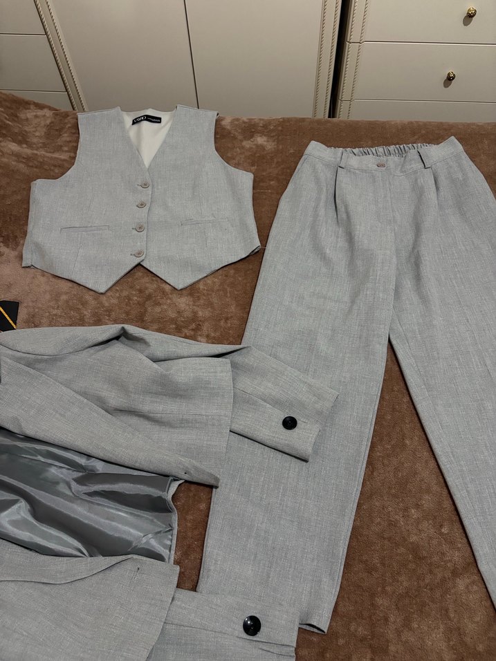 Gri keten kumaştan yapılmış, düğmeli yelek ve normal boy midi kesim pantolondan oluşan kadın takım elbisesi. Ofis kullanımı için uygundur.