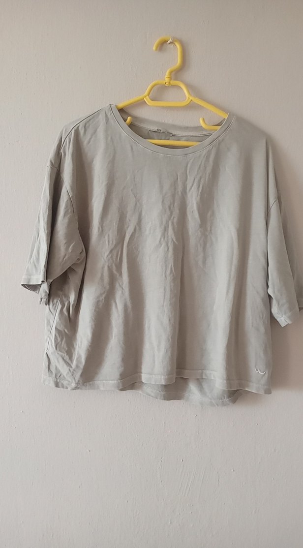 Gri keten kumaştan, kısa kollu ve yuvarlak yakalı, rahat kesim kadın tişört. Günlük kullanıma uygun, sade ve şık görünüm sunar.