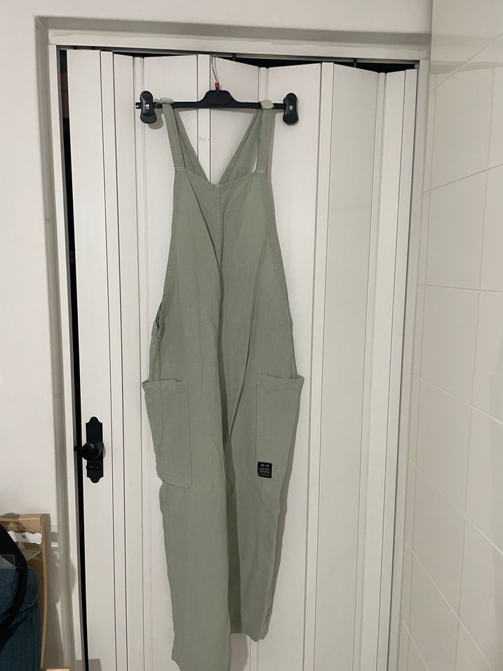 Gri keten kumaştan, askılı ve bel kemerli, bol kesim uzun tulum. Büyük cepleriyle gündelik rahat stil için uygundur.