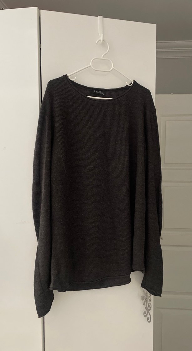 Gri renkte keten kumaştan yapılmış, yuvarlak yaka ve uzun kollu, salaş kesime sahip, normal boyda kadın kazak. Minimalist ve desensiz tasarımı günlük kullanım için uygundur.