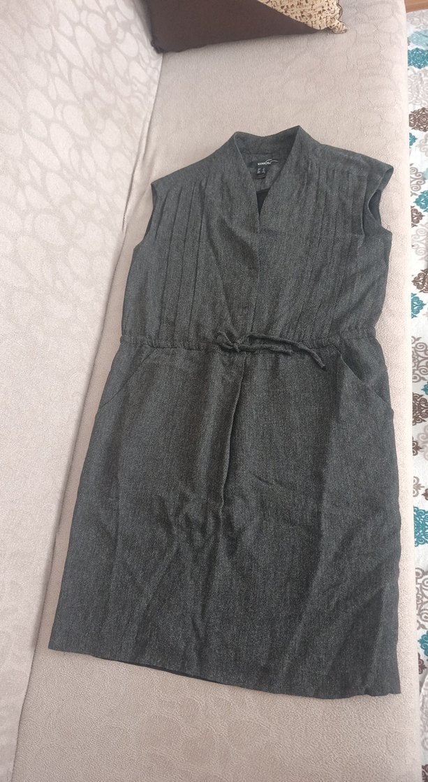 Gri keten kumaştan, V yakalı, kemerli ve salaş kesim hamile midi elbise. Günlük kullanıma uygun rahat ve şık bir model.