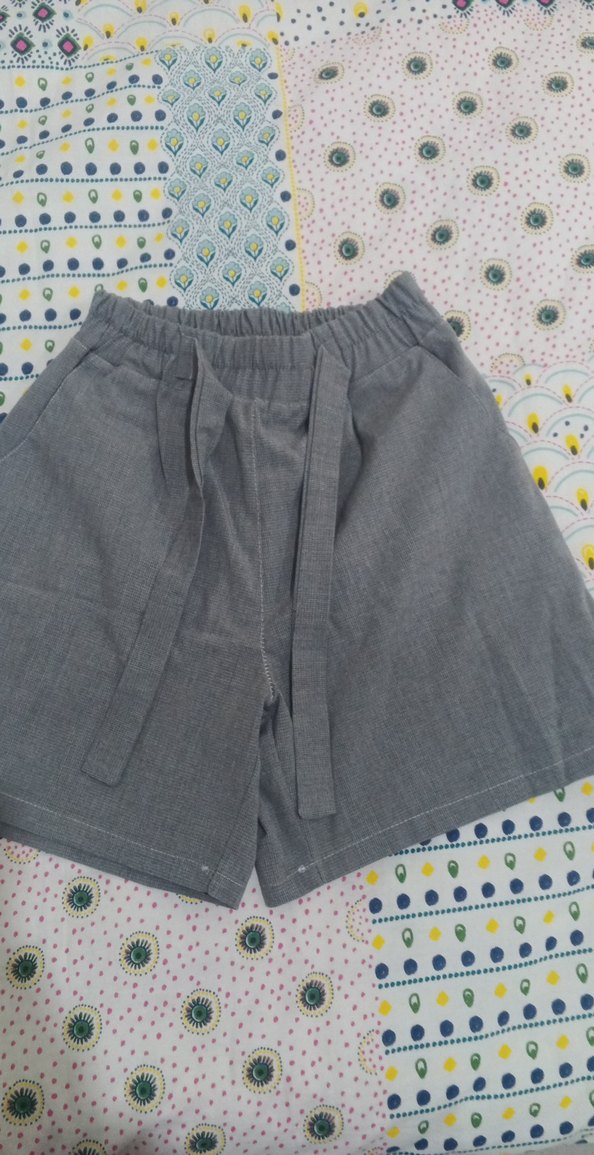Gri keten kumaştan, kemerli ve lastikli beliyle rahat, kısa kesim hamile şortu. Desensiz, gündelik kullanıma uygun.