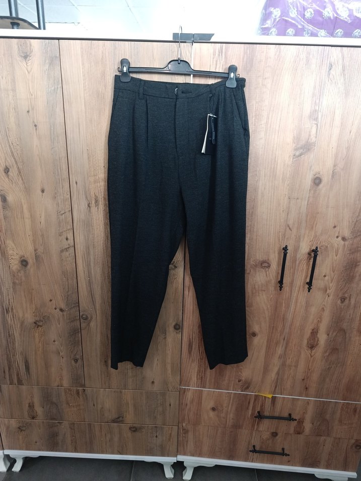 Gri keten kumaştan, kemerli ve rahat kesime sahip kışlık erkek pantolon