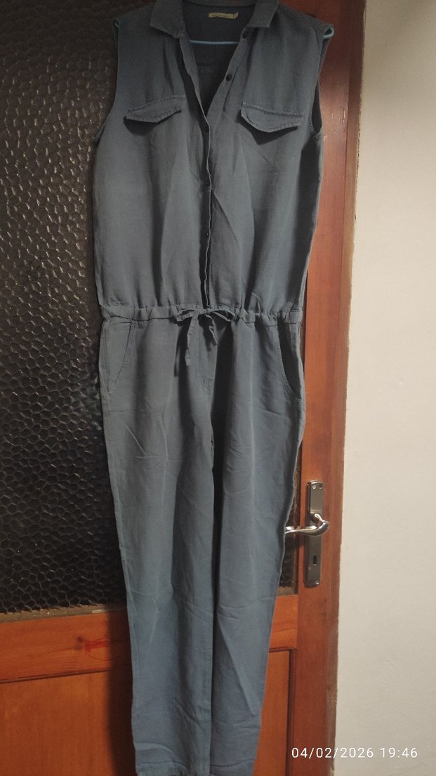 Kemerli, keten kumaştan gri, kolsuz uzun tulum. Notlu yaka ve rahat, minimalist kesimiyle dış mekan kullanımı için uygun.