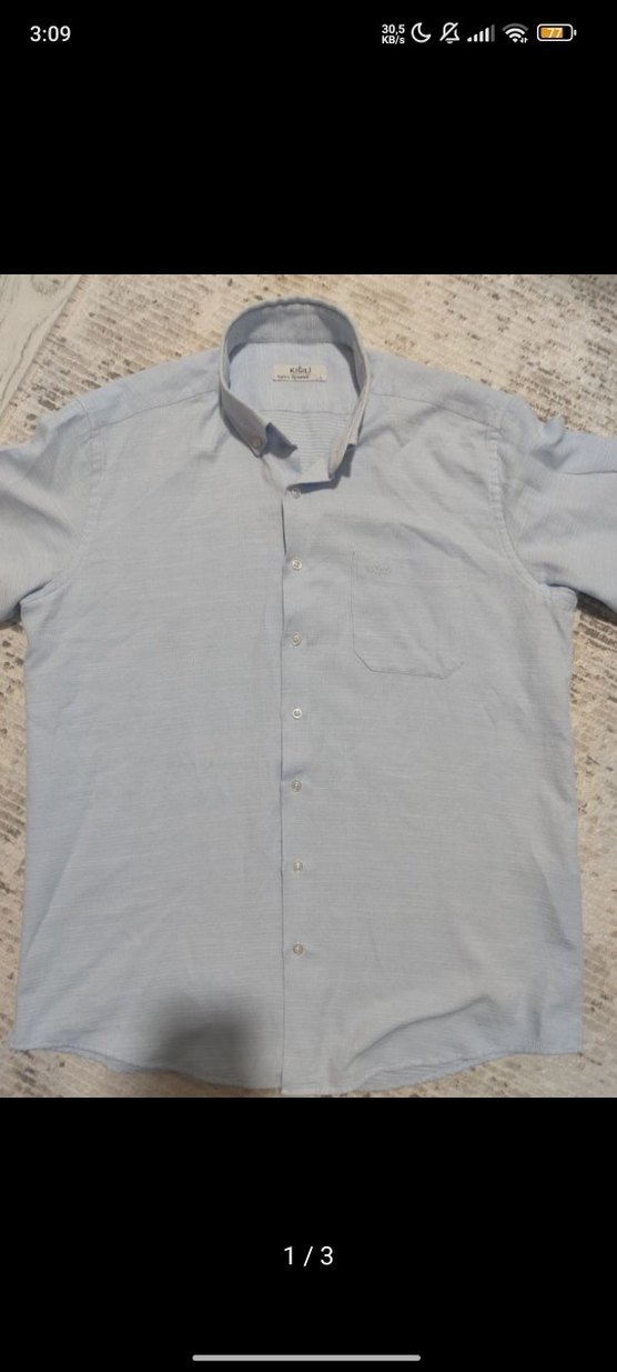 Gri keten kumaştan, kısa kollu, düğmeli ve normal kesim erkek gömleği, günlük rahat kullanım için uygundur.