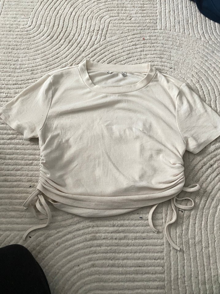 Keten kumaştan, kısa kollu ve yuvarlak yakalı, yanlardan büzgülü şık ve rahat hamile tişörtü. Günlük kullanıma uygundur.