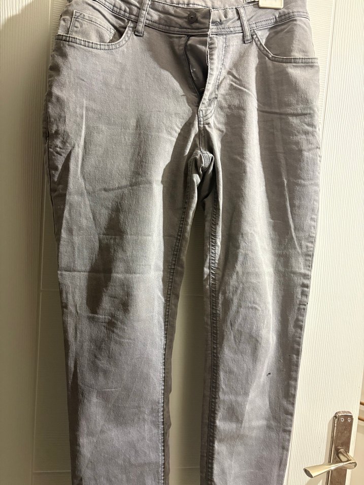 Gri keten kumaştan yapılmış, normal boy ve regular fit erkek pantolon, gündelik ve rahat stil için uygundur.