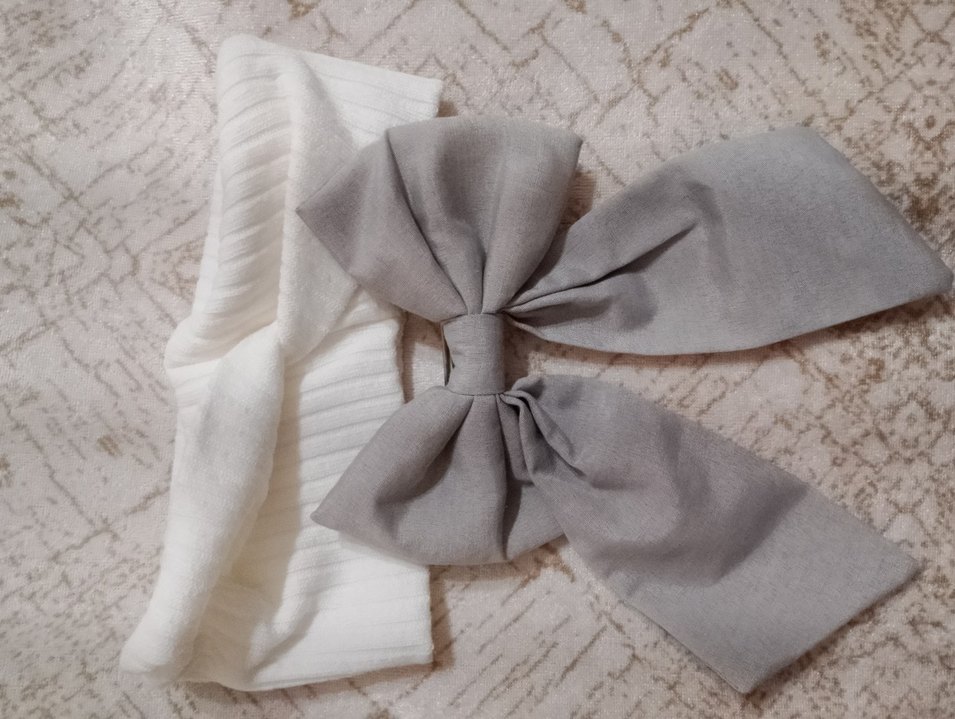 Yumuşak keten kumaştan gri fiyonk saç aksesuarı ve beyaz yumuşak ipeksi dokulu saç bandanası