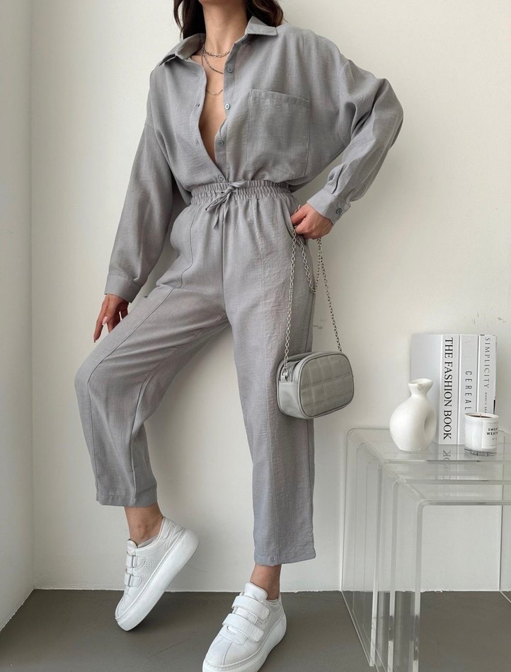 Kadın gri oversize keten dokulu gömlek pantolon alt üst takım