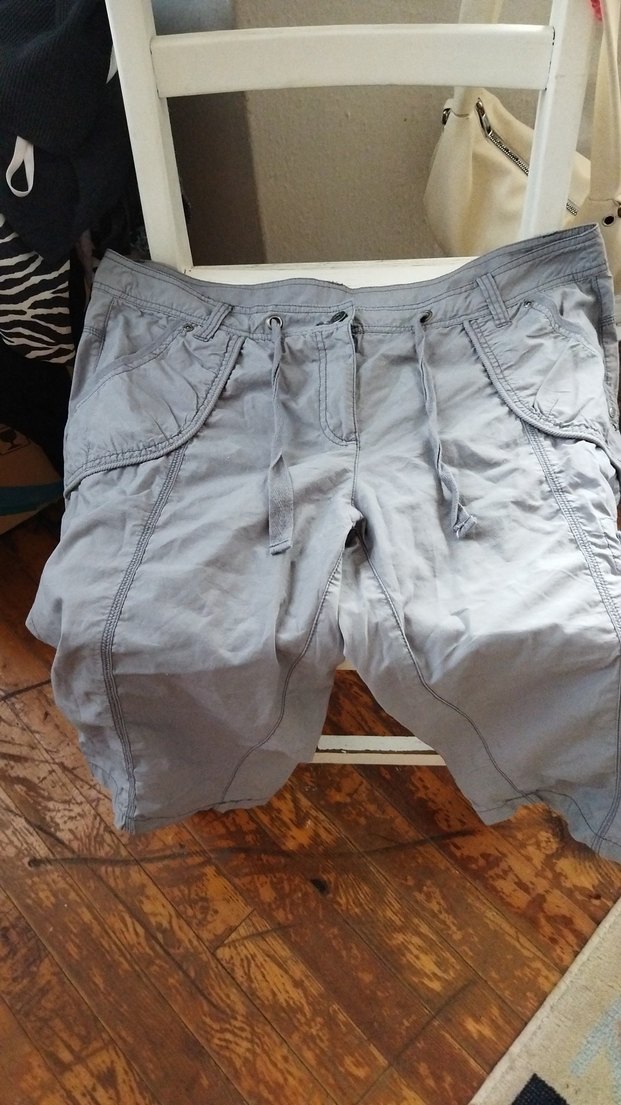 Gri keten kumaştan, kuşaklı ve cep detaylı bol kesim kısa hamile şortu. Dış mekan rahatlığı için uygundur.