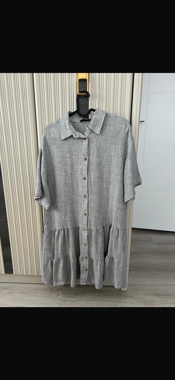 Gri keten midi boy elbise, düğmeli, kısa kollu ve yakalıdır. Salaş kesimi ve katlı etek detayıyla rahat ve bohem tarz sunar.