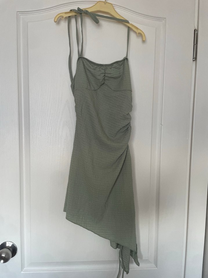 Gri keten kumaştan, askılı ve drapeli tasarıma sahip, asimetrik midi boyda şık ve sade bir elbise.