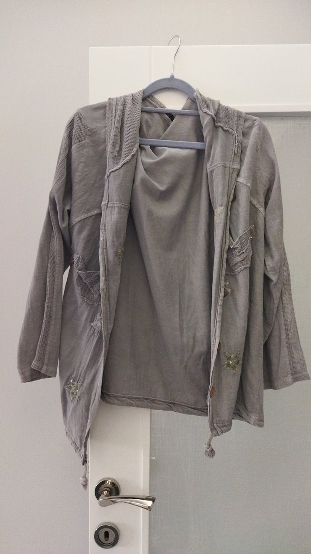 Gri keten hamile ceketi, bol kesim, uzun kollu ve düğmeli, yakası kesik ve bohem tarzda, günlük rahat kullanım için uygundur.