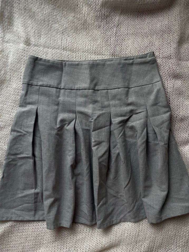Gri keten kumaştan, pileli ve bol kesim mini etek. Minimalist ve normcore tarzıyla ofis kullanımı için uygundur. Şortlu değil