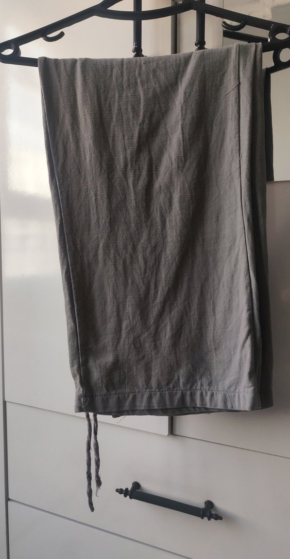 Gri keten kumaştan, midi boyda, rahat kesim ve drapeli tasarıma sahip, sade ve minimalist tarzda kadın pantolon.