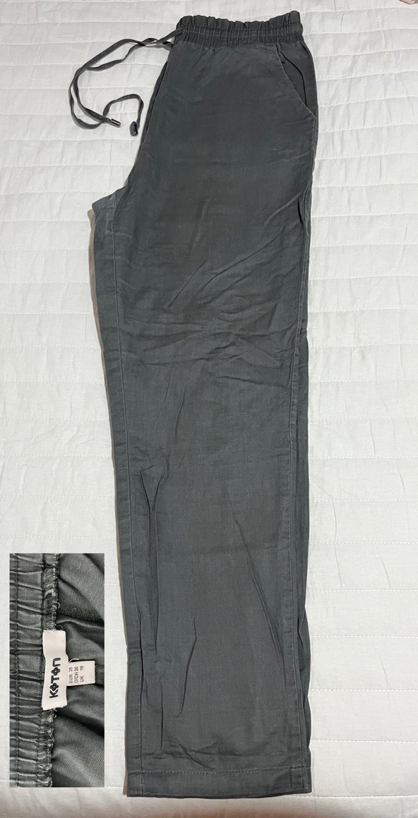 Gri keten kumaştan, midi boy ve salaş kesim kadın pantolon. Bel detaylı, günlük kullanıma uygun rahat bir modeldir.