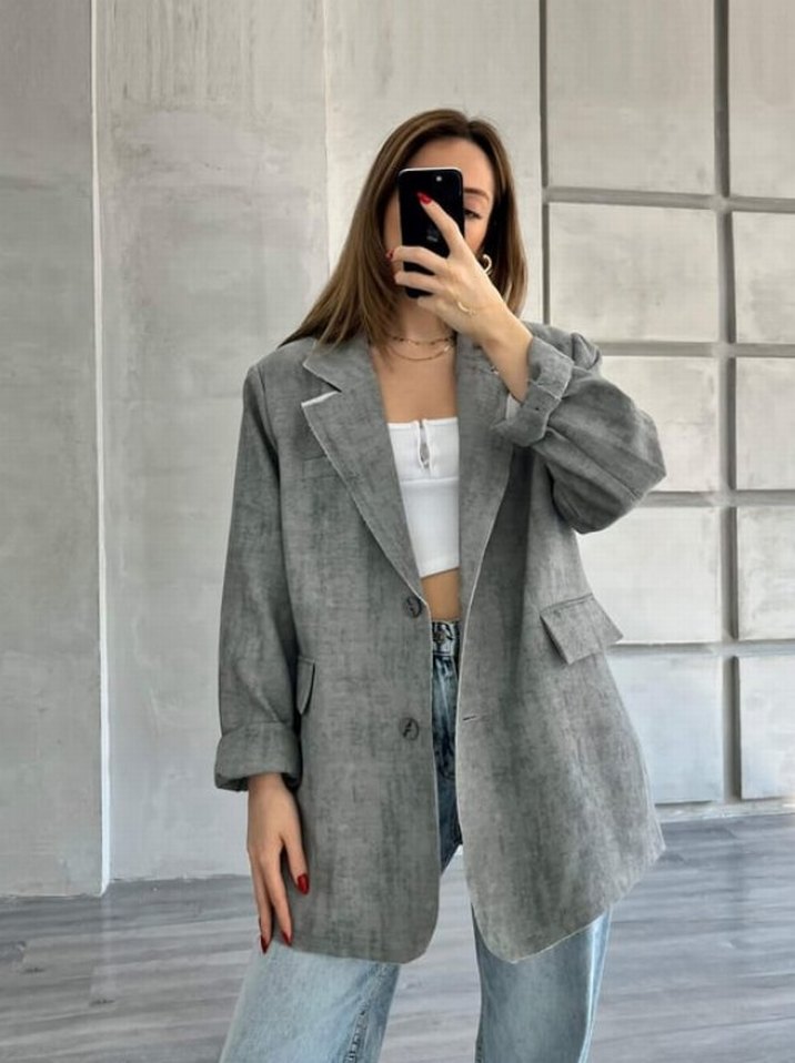 Gri keten kumaştan, düğmeli ön ve kısa mini uzunlukta, regular fit kesime sahip blazer. Notched lapel yaka ve uzun kolludur, hafif tie-dye desenlidir.