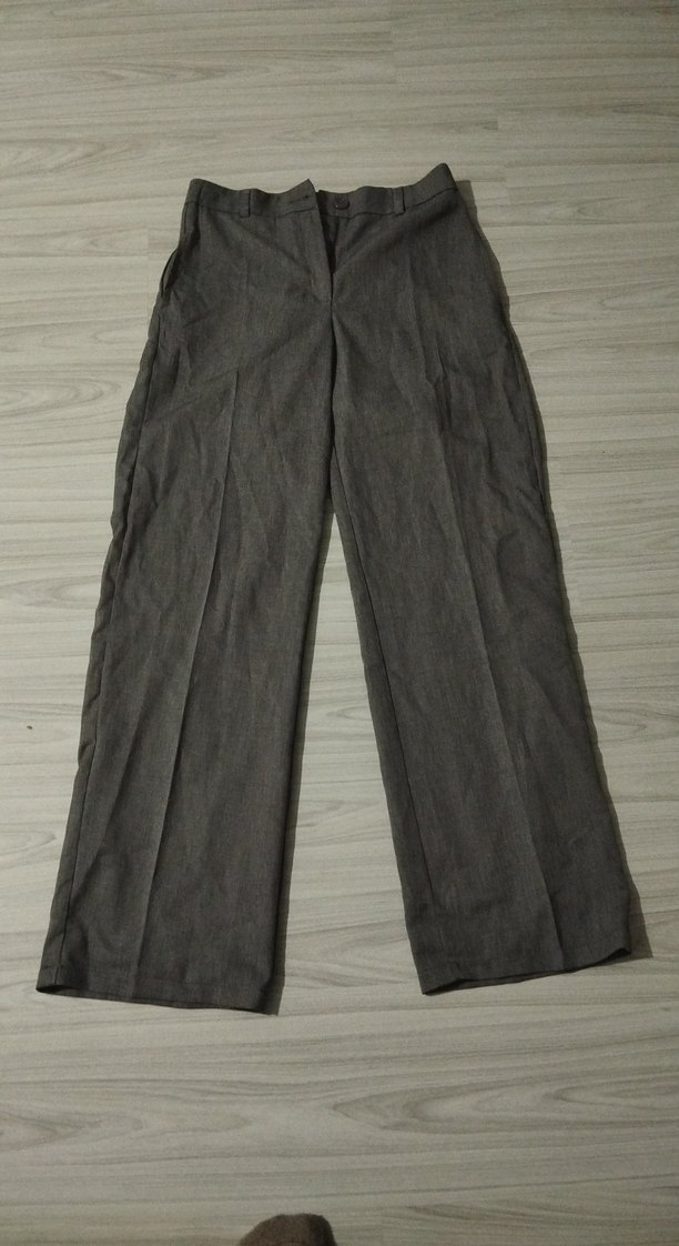 Gri keten kumaştan, pilili, normal boy midi uzunluğunda kadın pantolon. Ofis için uygun, normcore tarzda.