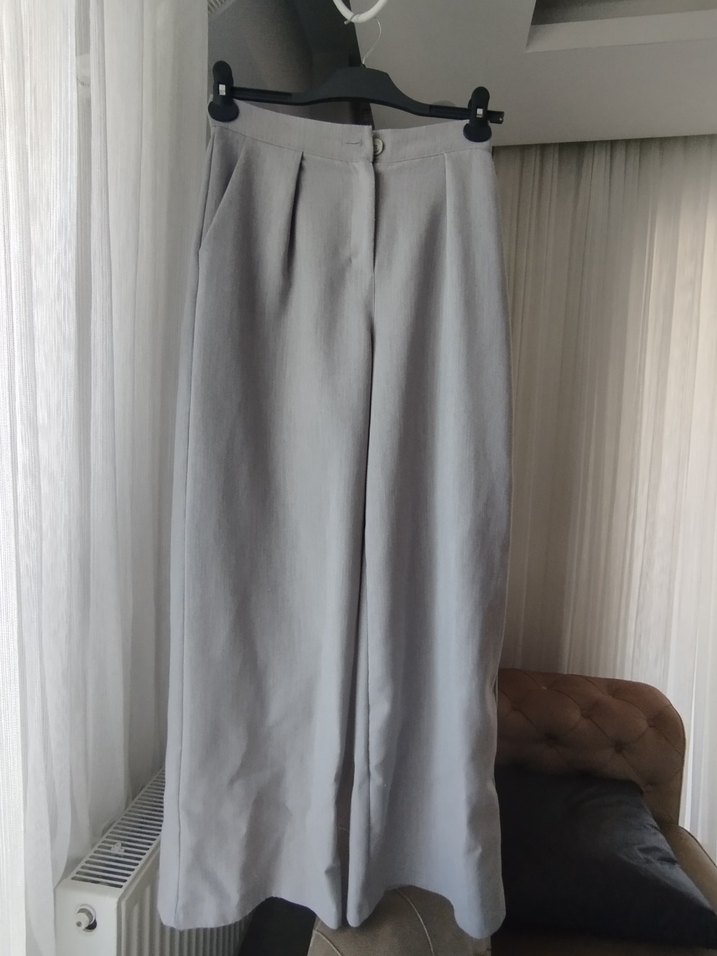 Gri renkte, keten kumaştan yapılmış, pilili ve bol kesim midi uzunluğunda kadın pantolon. Minimalist ve desensiz tasarımıyla ofis için uygundur.