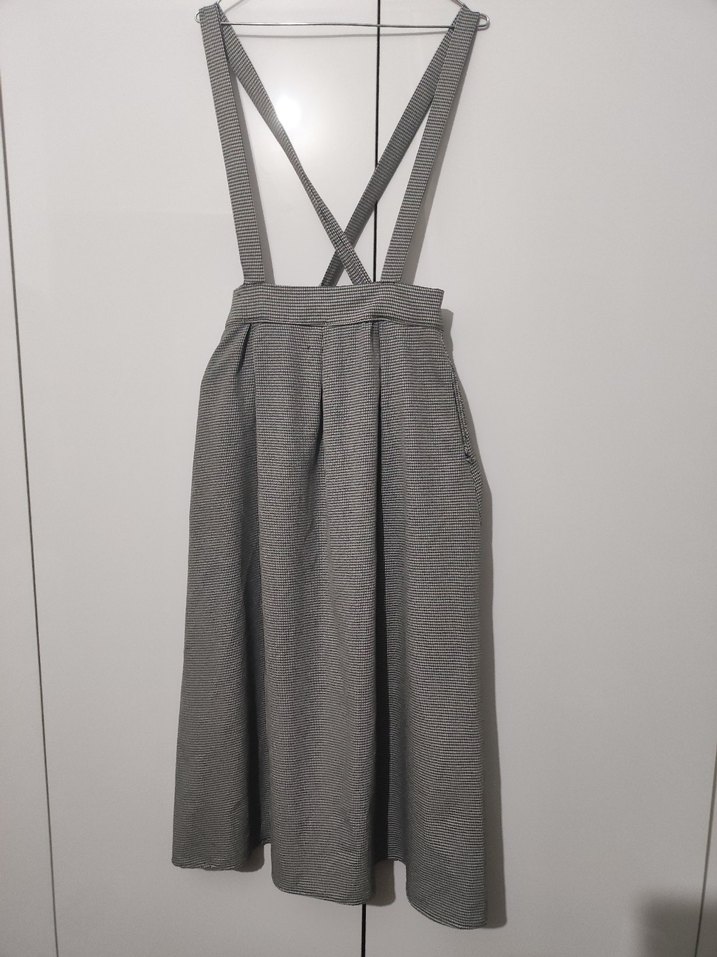 Gri keten kumaştan, pilili ve askılı, bol kesim midi etek. Minimalist ve normcore tarzıyla günlük kullanım için uygundur. Hiç giymedim . Kısa geldiği için satıyorum.
