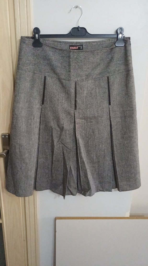 Gri keten kumaştan, pilili ve normal kesim kısa hamile eteği. Ofis ortamına uygun sade tasarım.