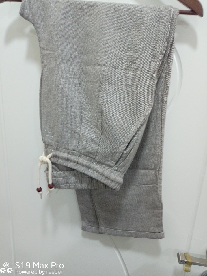 Düğmeli ve bağcıklı bel detaylı, gri keten rahat kesim kadın pantolon. Midi boy ve desensiz tasarım günlük sokak stili için uygundur.