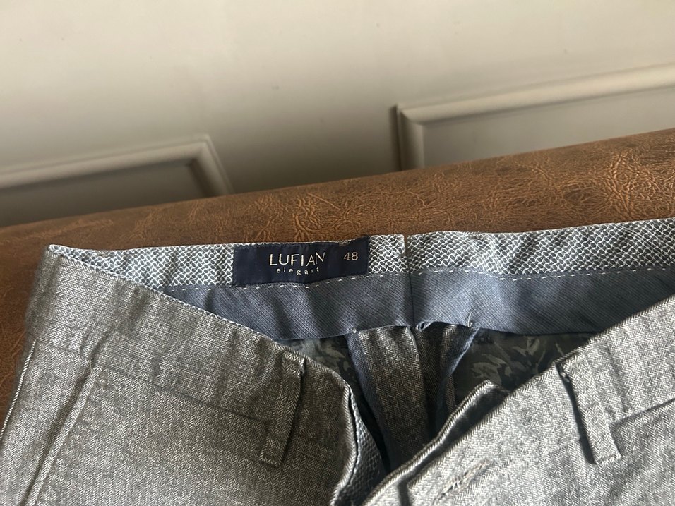 Gri keten kumaştan, düğmeli, regular fit ve kısa boy erkek pantolonu. Baskılı deseniyle sokak stili ve günlük kullanım için uygundur. Marka: Lufian.