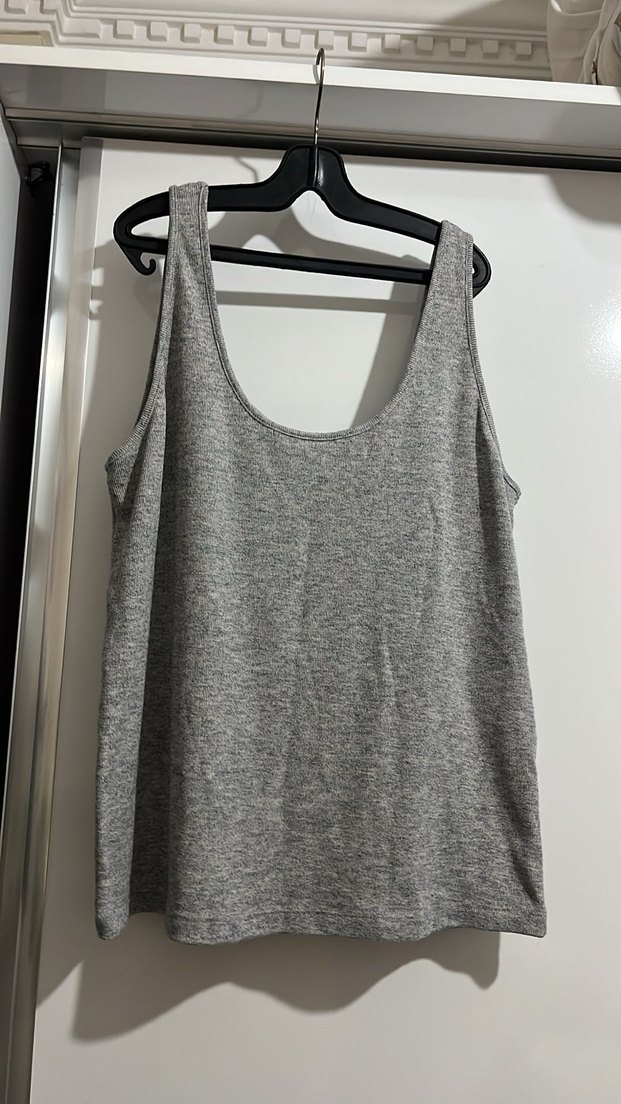 Kadınlar için gri, keten kumaştan, salaş kesim ve bisiklet yaka, kolsuz atlet. Günlük kullanıma uygun, sade ve rahat bir tarz sunar.